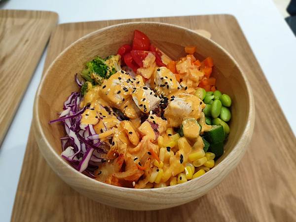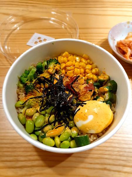 朋友A的韓式POKE, 選白米&雞胸肉, 他說雞胸肉比較乾柴, 也許是舒肥吃慣了, 泡菜不錯