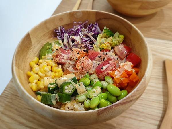 朋友B的招牌POKE, 有生魚, 選糙米, 醬汁搭配辣美乃汁