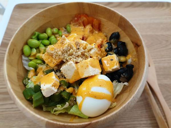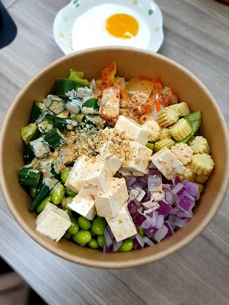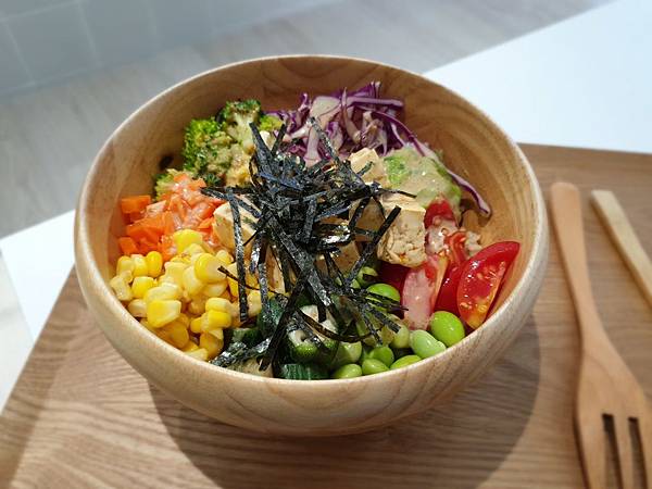 我今天吃蔬食POKE, 沒有生魚或雞肉, 用豆腐取代, 選了糙米加生菜, 整體上口味好吃, 胡麻醬口味也很中等不過膩, 糙米咬得比較累, 我都開玩笑說可以訓練咀嚼肌