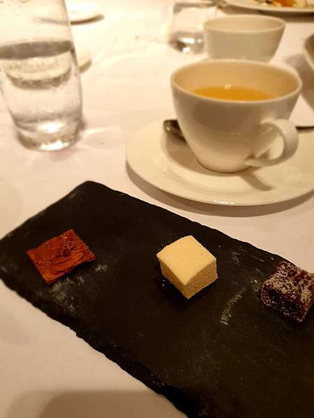 招待的小點心盤, 杏仁片/ 棉花糖/ 軟糖~ 這時我覺得酒的後勁上來了, 所以沒胃口了, 只能一直默默喝著我的洋甘菊, 讓自己清爽清爽, 哈哈哈