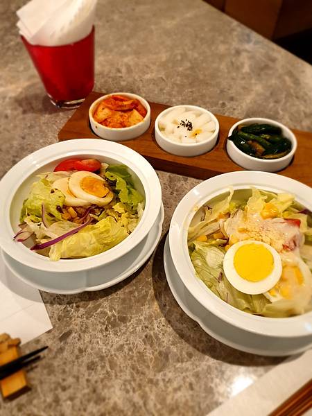 先挑沙拉口味, 就凱薩跟油醋各來一份, 貓媽嚐試後大概不愛油醋的酸, 所以把凱薩整碗端走啦