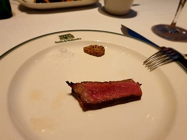 怎麼說呢, 除了酒友聚餐好友相聚, 以及無法避免的應酬, 平常時刻我是不怎麼喝酒的, 但是, 今晚的牛排大餐就是這麼讓我嘴饞, 對於酒, 也不懂太多, 所以是選了相對便宜且基本的的 Smith & Wollensky Napa Valley, 開頭是很滑順的口感, 不過吃了鹹食及牛排後, 這個酒就帶出點酸澀, 但整體上還是順口!