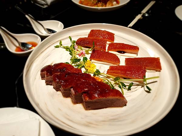 臘味雙拼-燒鵝+烤乳豬 1280, 選烤乳豬還要加價, 只是可惜這烤乳豬我不愛, 化皮烤乳豬沒有化皮感, 而且我有感受到點豬味, 這樣我就不行, 但燒鵝很好吃, 尤其搭配紅酒蜜汁很讚