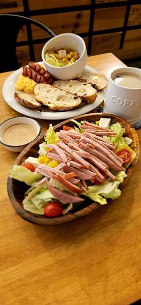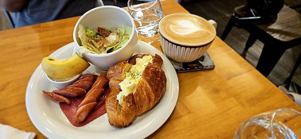 這是點蛋沙拉可頌跟老媽分食, 除了搭配的美式咖啡, 再加點一杯拿鐵... 套餐中總是避不開熱狗火腿等