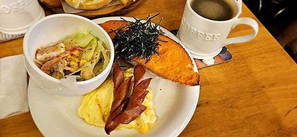 南瓜吐司(搭美式咖啡)~ 吐司也是滿有口感的, 帶點小咬勁, 風味也不錯, 但我是覺得傳聞中的誇張好吃就是太誇張啦~ 起司蛋呢 就是我本人比較不愛吃太多起司蛋