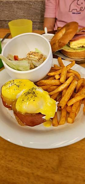 202311- 這次選了原味的班尼迪克蛋, 水波蛋就放在小圓片法國麵包上, 可以沾著半熟蛋吃~ 但是班尼迪克蛋的靈魂荷蘭醬風味我大概不是那麼喜歡, 呵呵呵